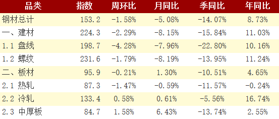 2. 盘线库存下降速度有所加快,螺纹钢库存下降速度有所放缓;热轧卷板库存由升转降,冷轧库存由降转升,中厚板库存上升速度略有放缓